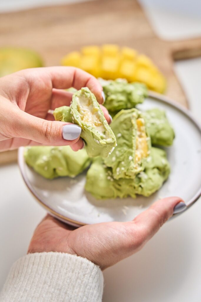 Try these delicious mango bites coated in matcha-infused chocolate.