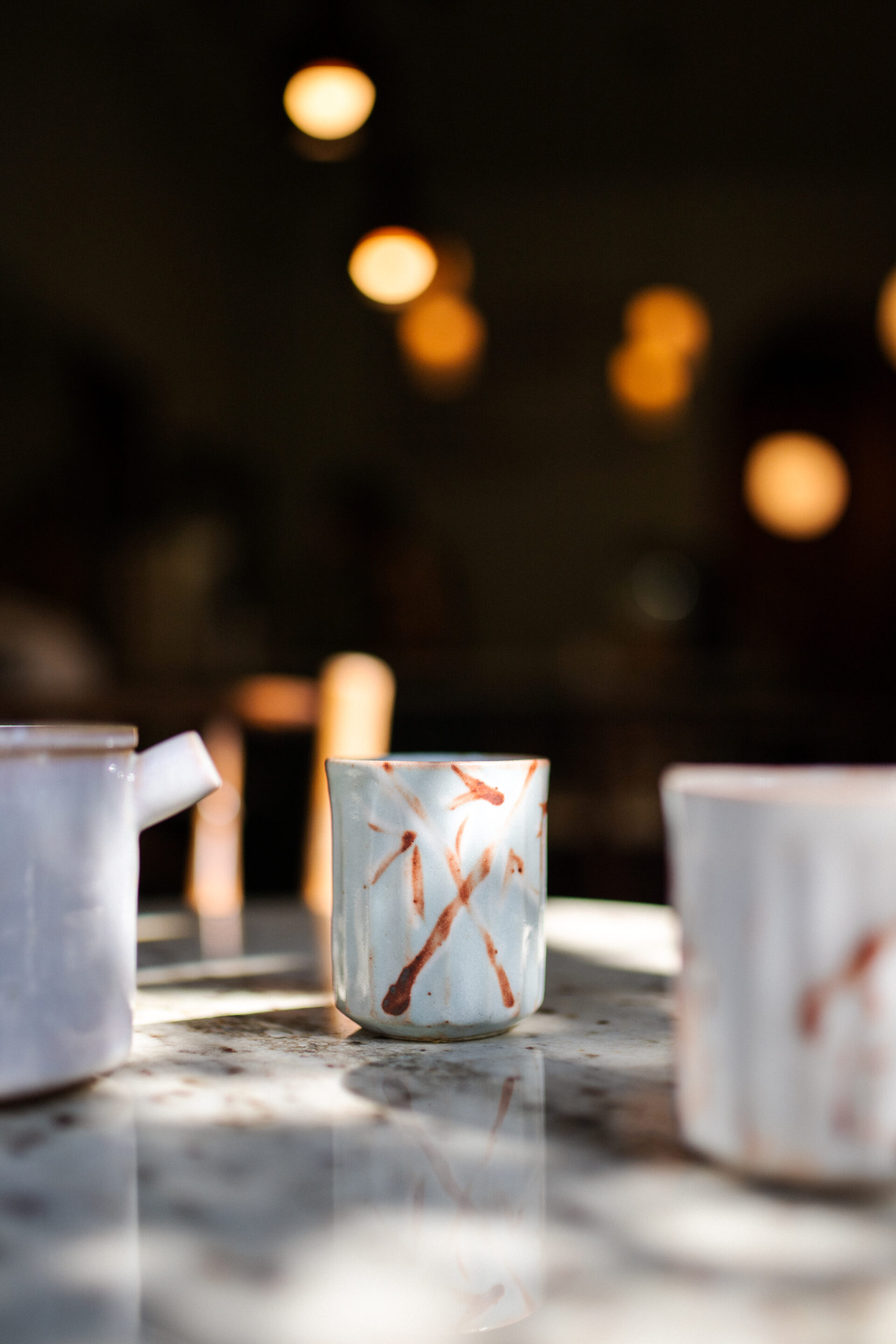 Ten unikatowy kubek do herbaty został wyprodukowany według szkoły ceramiki Shino, w mieście Toki na japońskiej wyspie Honsiu. Od lat produkuje się tam naczynia w zgodzie z japońską tradycją herbacianą. W pierwszym etapie naczynie zostało ukształtowane za pomocą formy. Później końcowy kształt i wzory wykonano ręcznie. Dzięki temu każdy kubek jest niepowtarzalny.